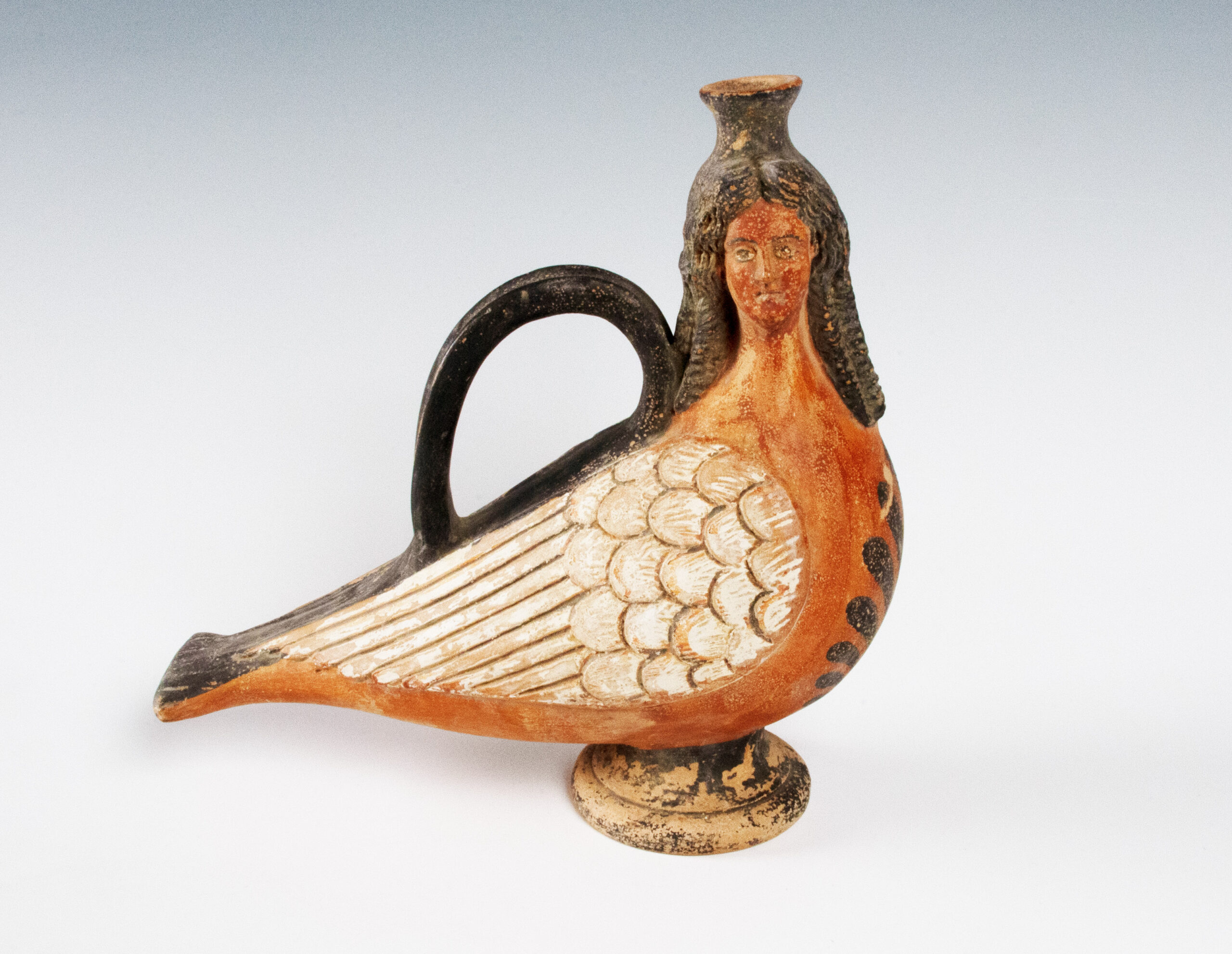 鳥の胴体に人間の女性の頭がついた形をしており、頭頂部に注口が、背面に把手がついています。これはギリシア陶器の中で「アスコス」とよばれる型式の容器で、内容物はワインや油であったと考えられます。当時のワインや油は大きな甕(かめ)で貯蔵されていましたが、必要量をアスコスに移し入れておくことで、杯やランプへ容易に注ぐことができました。実在または架空の動物を模した形状のアスコスは、イタリア半島中部のエトルリアと呼ばれる地域で、ギリシアの影響を受けて紀元前4世紀頃に盛んに製作されました。