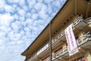 今回の特別展では多くの方々の目に触れられることを期待して、北側の垂れ幕を通行者の多い建物の東側に取り付けました。