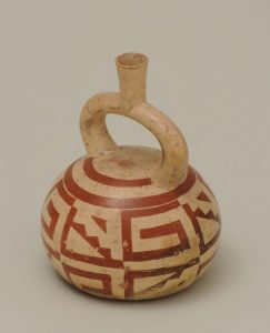 実は渦巻き文と階段文の組み合わせはモチェ文化以外でも見られます。古くは、紀元前800年頃から紀元前500年頃にかけてつくられた土器にも表現されています。また、モチェ文化と同じ時代にペルー北高地で栄えたレクワイ文化の土器にも描かれています。